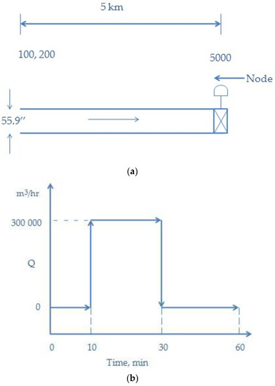 As the outlet valve opens, and the outflow increases from zero to 300,000 m3/h, flow rate m3/h is shown in the standard condition (100 kPa, 288.15 K) while the inlet pressure is maintained at 50 bar. The mathematical model of the system is based on the equations of unsteady gas motion, continuity, and energy, using the equation of state of a real gas, which forms a closed system. Mathematical model created for the linear section of the pipeline length L = 5 km, at the beginning of which gas is taken off at a constant mass flow rate .