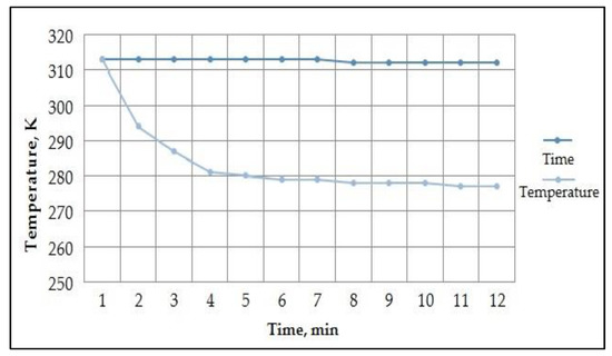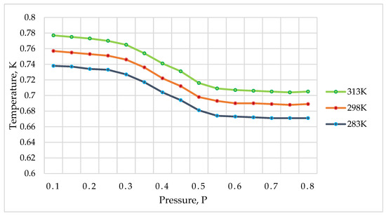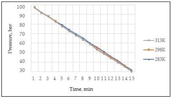 When the absolute pressure in the receiver changes from 10 bar to 5 bar (the end of the critical outflow zone), the flow coefficient changes from 0.776 to 0.709 at the temperature in the 288 K receiver. An increase in the gas temperature in the receiver leads to a more significant deviation of the actual flow rate from the theoretical one. Then, at a temperature in the 283 K receiver and a pressure of 10 bar, the flow coefficient is 0.776, and as the temperature rises to 298 K, it drops to 0.756, and as the temperature rises further to 313 K, it drops to 0.738 (Figure 9).