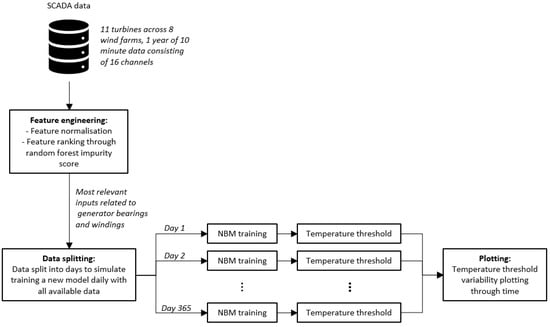 Section 2 outlines the methodology and data used throughout this research. This will provide details of the data itself, the machine learning algorithm used to build the NBM’s, model inputs and outputs, model training, as well as how results were generated from the NBM that allowed thresholds to be compared through time. Section 3 presents the results, providing a comparison of temperature thresholds across different turbines and components within the generator. Finally, Section 4 presents the discussion and key conclusions drawn from the work.