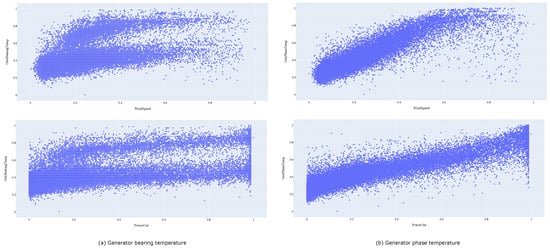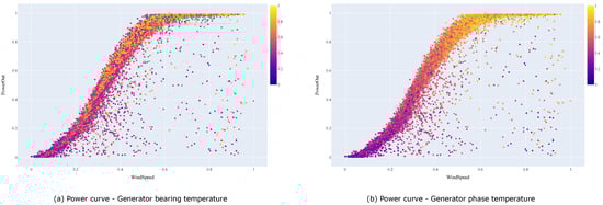 First of all, let us consider the power curve in relation to the two component temperatures that are to be monitored through a NBM. In Figure 2, (a) shows the power curve in relation to the generator bearing temperature, while (b) shows the same plot for the generator phase temperature. Note that the raw features have been cleaned to remove all data gathered while the turbine had a power output of below zero, and then normalised between 0–1.