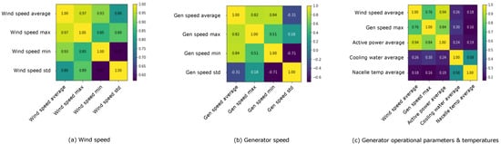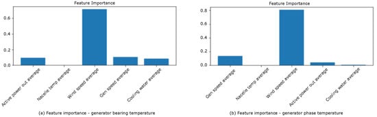 From the data inputs available, we see high positive correlation scores between average wind speed value and its distribution around the mean. The same can be said for generator speed when considering the maximum and minimum, although with more random standard deviation. With regard to operating parameters and surrounding temperatures, high correlation between power, wind speed and generator speed is observed. Cooling water temperature and nacelle temperature are not correlated linearly to turbine operation, although they are somewhat correlated to each other. Although useful, these metrics are quite restrictive and are not suitable for ranking high dimensional nonlinear relationships. To navigate this issue, another useful way to rank features is through a model based approach. For ease of application, a tree based model was used and involves training a random forest model and assessing feature importance based on the average decrease in impurity across all decision trees in the forest. As this is automatically computed during the training phase, it offers a convenient approach to assessing feature importance when dealing with nonlinear relationships. Feature importance of inputs in relation to NBM 1 (generator bearing temperature) and NBM 2 (generator phase winding temperature) are presented in Figure 5a,b, respectively.