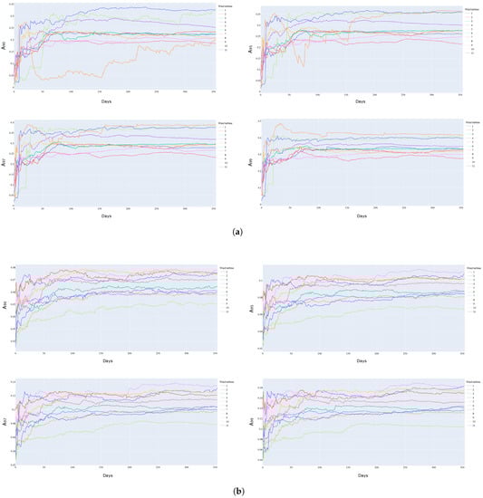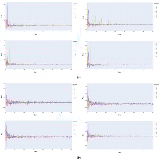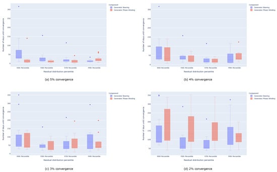 For each of the two NBM’s shown in Figure 9a,b, threshold convergence of 2%, 3%, 4% and 5% were considered across all alarm percentiles. Results are presented in Figure 10 and showed significant variation between turbines, even when considering the same alarm percentile and convergence criteria. In general, it was found that decreasing the convergence percentage from 5% to 2% led to longer convergence times. This would be expected due to tighter convergence constraints. The average convergence time based on 3% was between 50–60 days, with the majority of turbines not requiring more than 120 days, or approximately four months of data. These times significantly increased when using the 2% convergence criteria, which will be discussed in more detail during the next section.