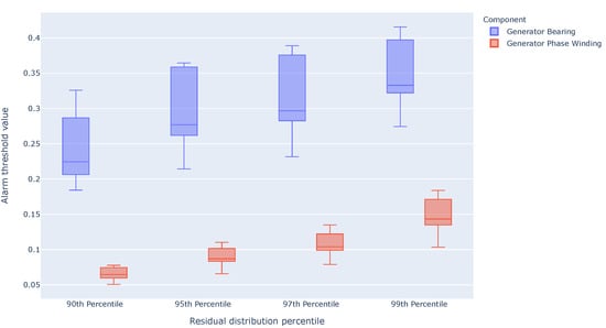 First of all, we see a much lower alarm threshold value for the generator winding in comparison to the bearing on average. Additionally, as expected due to the error distribution, a general increase is also observed as the higher percentile is used. With regard to variation between turbines, there was larger variation in the generator bearing thresholds compared to the phase windings. For the bearings, the variation between turbines was fairly consistent for each percentile; however, the windings showed increased variation when higher percentiles were used.
