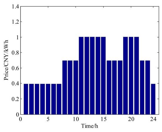 In other words, in the public charging stations of China, the charging prices Prchg,t can be represented as the sum of the TOU electricity price Prgrid,t and the charging service price (fee) Prservice,t, and hence . Therefore, it is possible to realize the coordinated charging of EVs by considering the manner in which the charging service prices are time-varying and flexibly formulated.