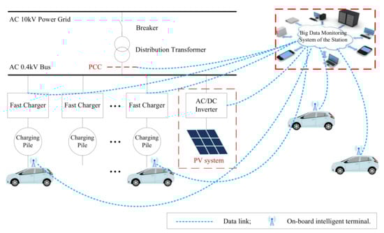 This study was motivated by the problems that exist in fast charging stations. Considering the operation costs and the promotion of sustainable energy generation, a charging station is likely to be equipped with a photovoltaic (PV) distributed generation system. A typical topology of a fast charging station, in which PV is included, is depicted in Figure 3. Since the power at the PCC affects the distribution networks to some extent, it is necessary to improve the daily load curve at this point.