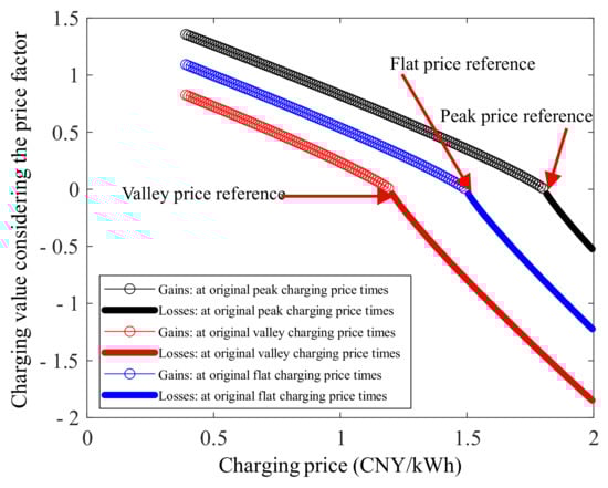 According to Equation (2), Figure 4 depicts the charging values in different periods (peak charging price periods, flat charging price periods, and valley charging price periods, respectively) of the original charging tariff before optimal pricing. The detailed reference prices are based on the charging prices in Beijing, that being 1.8044 CNY/kWh in peak hours, 1.495 CNY/kWh in flat hours, and 1.1946 CNY/kWh in valley hours. Take the situation in peak charging price hours as an example; if the determined charging price after optimization is higher than the peak price reference, it means losses to users, and the charging value is relatively low. On the contrary, if the determined charging price is lower compared to the peak price reference, it means gains to users, and the charging value is relatively high.