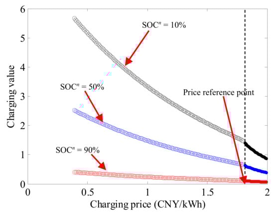 According to Equation (4), Figure 5 depicts the charging values of different SOCs at peak price times of the original charging tariff. It can be deduced that a smaller SOC corresponds to larger charging values at the same time. When the SOC of EV approaches 100%, charging is not an absolute necessity anymore, and the charging value for the EV user is close to zero at this moment. At a certain SOC, the charging value function still follows the basic value function of Equation (2), except the natural exponential function is introduced to express the law of natural growth. This is because, when the SOC is smaller, the charging value brought by the part of Equation (4) increases faster compared to the higher SOC, which can be easily derived from the derivative operation of .