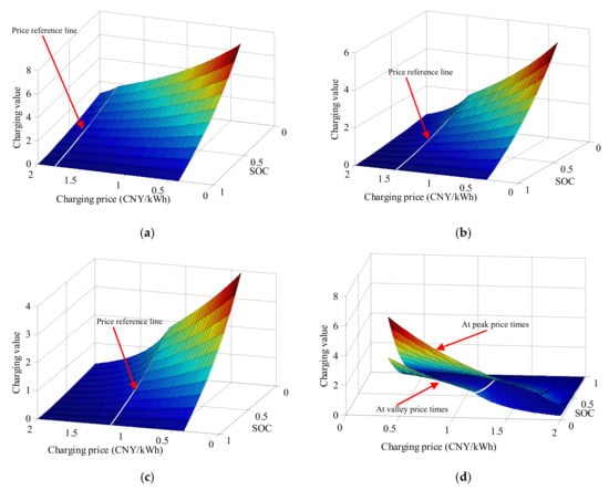 Figure 6 shows the three-dimensional plots of the charging values considering both the price factor and SOC, in which the relationship between charging price, SOC and charging value defined by the equation is clearly revealed. As shown in Figure 6a–c, both the lower charging price after pricing optimization and the lower SOC of EVs will result in a higher charging utility value. The highest charging value will appear at the lowest charging price and the lowest SOC, indicating the demand for charging and the willingness for price response. If the SOC is 100%, there is no battery capacity for charging. Thus, the charging value at this moment is zero, since the charging price and SOC are always independent. In addition, as depicted in Figure 6d, the charging values are higher at peak price times compared to that at the valley price times. This is due to the same reason as is shown in Figure 4, and can be described by the following: for the same charging price after optimization, EV users are more likely to change their charging behaviors at peak price times compared to valley times because of the bigger reduction in charging price.