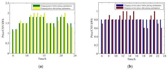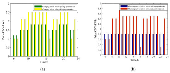 Comparison of prices before and after pricing optimization in Scenario I, reducing both the peak-to-valley ratio and the operation cost as the objectives: (a) Original and optimal charging prices; (b) original and optimal charging service prices.