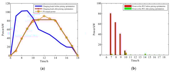 Optimized by PSO, Figure 12a depicts the charging loads before and after pricing optimization in Scenario II. It can be seen that solar curtailment exists between the times of 11:00 and 16:00 because of the mismatch of uncoordinated commuting charging and PV generation. Through the application of coordinated charging based on optimal charging prices, the daily solar curtailment has been reduced from 195.24 kWh to 11.15 kWh. The solar curtailment rate has also been reduced from 30% to 1.7%. Meanwhile, the peak power at the PCC of the charging station has been reduced significantly, from 80.52 kW to 4.27 kW, which can be seen clearly in Figure 12b. The power capacity demand for the utility grid decreases significantly. Therefore, it is conceivable that the basic electricity fee of the charging station is expected to decrease as well.