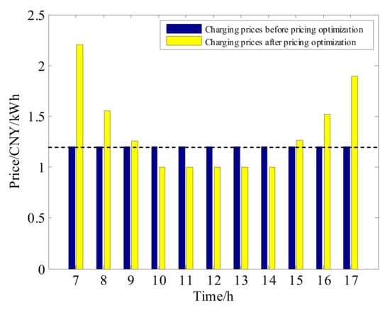 As shown in Figure 8, in the case of uncoordinated charging, the peak-to-valley ratio was 0.502. However, with the coordination of optimal charging prices, the peak-to-valley ratio increased to 0.8797, and the load peak increased significantly, which may cause the overload of the distribution transformer. This is because the model of the pricing optimization is a single-objective problem, only considering the operation cost of the charging station. By calculating based on the prices in Figure 9, the electricity purchase cost of the charging station reduced to 4002.4 CNY/day with price based coordinated charging, from 4727.1 CNY/day in the case of the original charging prices. Moreover, the revenue of the station operator increased from 4580.6 CNY/day to 5256.4 CNY/day. Thus, an additional 14% of profits are earned by the proposed pricing optimization.