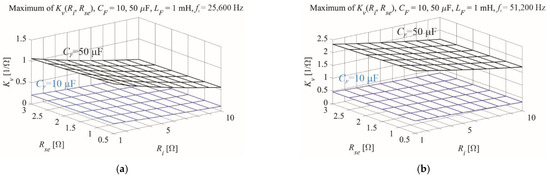 The dependence of maximum voltage gain Kv on current gain Ri and equivalent serial resistance Rse for (a) fs = 25,600 Hz and (b) fs = 51,200 Hz. In practical terms, the gains do not depend on Rse for the assigned VSI parameters, LF = 1 mH and CF = 50 μF.
