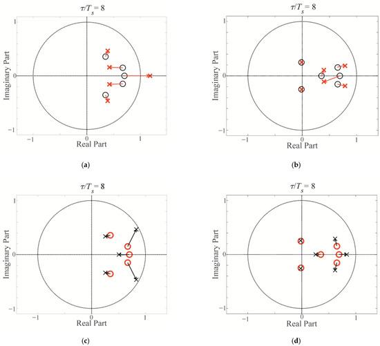 Pole shifts of the closed-loop CDM system (with LF = 2 mH, CF = 51 μF, and τ = 8Ts), showing (a,b) a system configured for RCDM = Rse = 2 Ω (black circles) subjected to a decrease in Rse to 0.4 Ω (red crosses), and (c,d) a system configured for RCDM = Rse = 0.4 Ω (red circles) subjected to an increase in Rse to 2 Ω (black crosses); (a) S(z−1) order 2, R(z−1) order 2, Pz(z−1) order 5; (b) S(z−1) order 2, R(z−1) order 3, Pz(z−1) order 6 (given additional plant delay); (c) S(z−1) order 2, R(z−1) order 2, Pz(z−1) order 5; (d) S(z−1) order 2, R(z−1) order 3, Pz(z−1) order 6 (given additional plant delay).