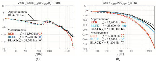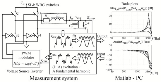 An additional delay can be introduced by double edge modulation [27]. The sum of these delays is relevant for control system design if the switching frequency fs is insufficiently high. However, as shown by Equations (4) and (11), the delay is compensated for during the relative measurement [13] of the control transfer function of the bridge and filter KCTRL, because a delay of period nTs concerns both the fundamental harmonic and the excitation. As presented, the relative appointment of the magnitude and phase cancels this delay.