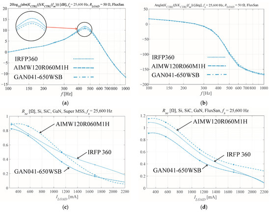 (a) Magnitude and (b) phase Bode plots of the VSI control function with a bridge composed of Si, SiC, and GaN transistors using a FluxSan coil core and a switching frequency fs of 25,600 Hz; (c) the calculated dynamic serial resistances Rse for the Super MSS core with fs = 25,600 Hz; (d) calculated dynamic serial resistances Rse for the FluxSan core with fs = 25,600 Hz.