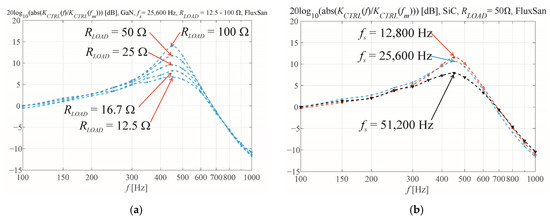 (a) Magnitude Bode plots for a bridge composed of GaN transistors, with switching frequency fs = 25,600 Hz and RLOAD = 12.5–100 Ω; (b) magnitude Bode plots for RLOAD = 50 Ω, using SiC transistors and FluxSan core, for fs = 12,800, 25,600, and 51,200 Hz.