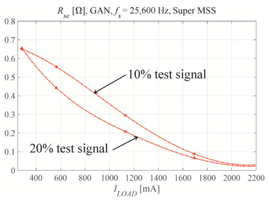 Using Equations (43) and (44), the equivalent serial resistances can be calculated from the magnitude Bode plots as a function of the VSI inductor current. The inductor current is higher than the load current, and flows through the bridge switches. The accuracy of the calculations is limited by the resolution by which the maximum magnitude can be found. This is demonstrated in Figure 8a; for the lowest load resistance of 12.5 Ω, the curve maximum is difficult to locate precisely via interpolation between the measured points. The amplitude of the test signal relative to the fundamental must be carefully selected. Figure 9 presents the serial equivalent resistance measurements for test signal amplitudes of 10% and 20% for fs = 12,800 Hz, GaN transistors, and a Super MSS core. All presented calculations used a 10% test signal.