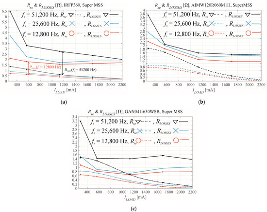 The serial resistances Rse and RLOSSES for (a) Si, (b) SiC, and (c) GaN transistors when using coil core material Super MSS.