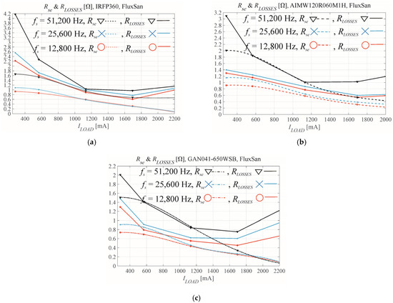 The serial resistances Rse and RLOSSES for (a) Si, (b) SiC, and (c) GaN transistors when using the coil core material FluxSan.