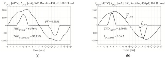 The various resistances RCDM were used in the control law of the CDM controller for the different equivalent serial resistances of the VSI when using the nonlinear rectifier RC load defined in IEC 62040-3 (PF = 0.7) [1]. The THD of the output voltages was measured for SiC transistors at fs = 25,600 Hz using Super MSS coil core material, with both open-loop control and CDM control with τ = 8Ts. Figure 13 shows the output voltage and current.