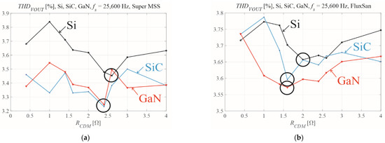 Graphs of THDVOUT for the different RCDM values at fs = 25,600 Hz for the Si, SiC, and GaN transistors with (a) Super MSS and (b) FluxSan coil cores for the standard rectifier RC load. Black circles highlight the THDVOUT minima.