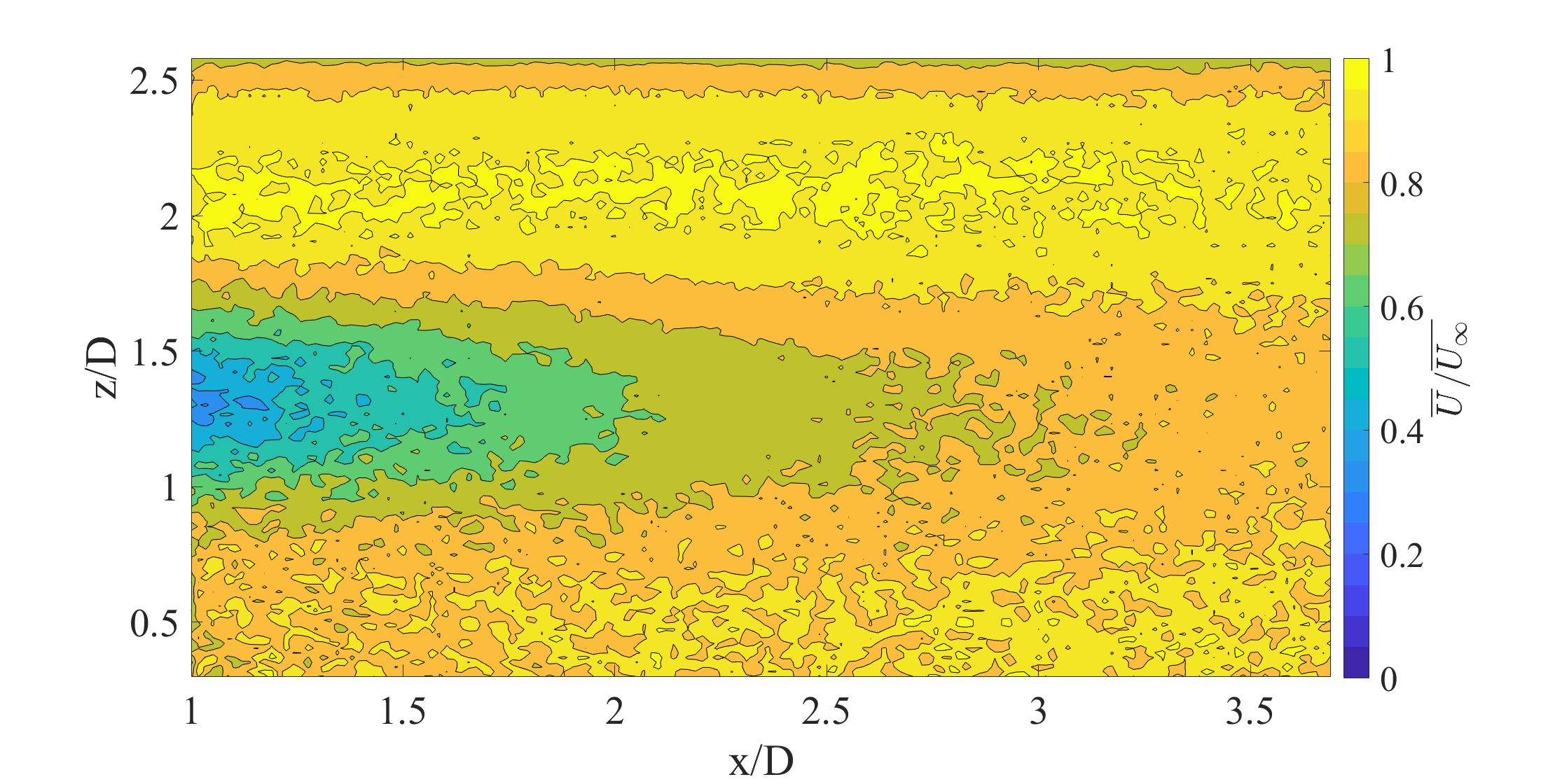 Particle image velocimetry was used to measure the flow in several locations. For each control (conventional operation) and treatment (AIC), vertical planes spanning from the end of the nacelle of an upstream turbine to the nose of the next downstream turbine, as shown in