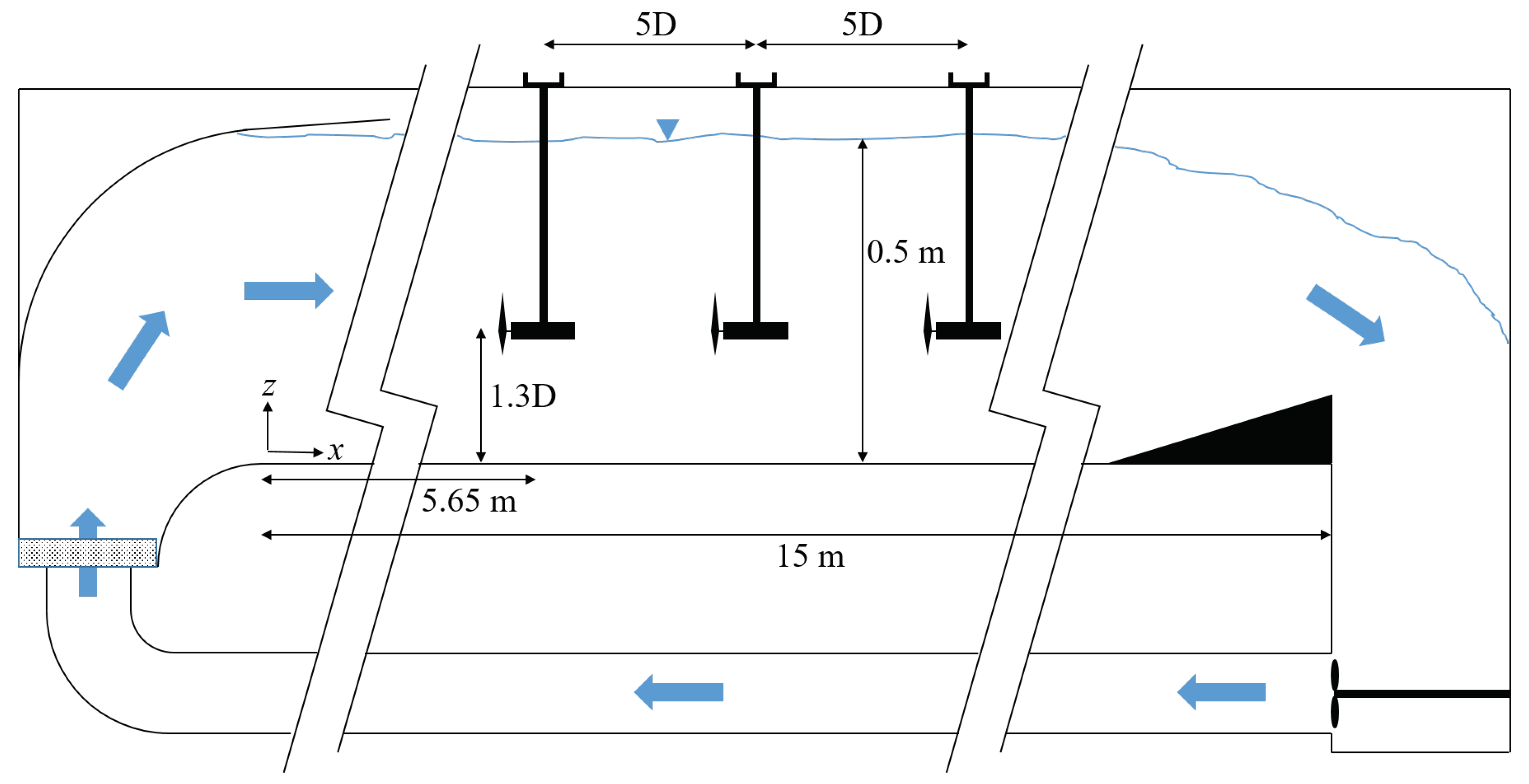 21] for Reynolds independence of second-order statistics. The Froude number is 0.25. The blockage ratio (the ratio of the sum of rotor-swept areas to the cross-sectional area of the flume) is only 3.8%, assuming a solidity (the ratio of the blades’ total area to the rotor-swept area) of one (the worst-case scenario), and well below standard requirements for corrections [