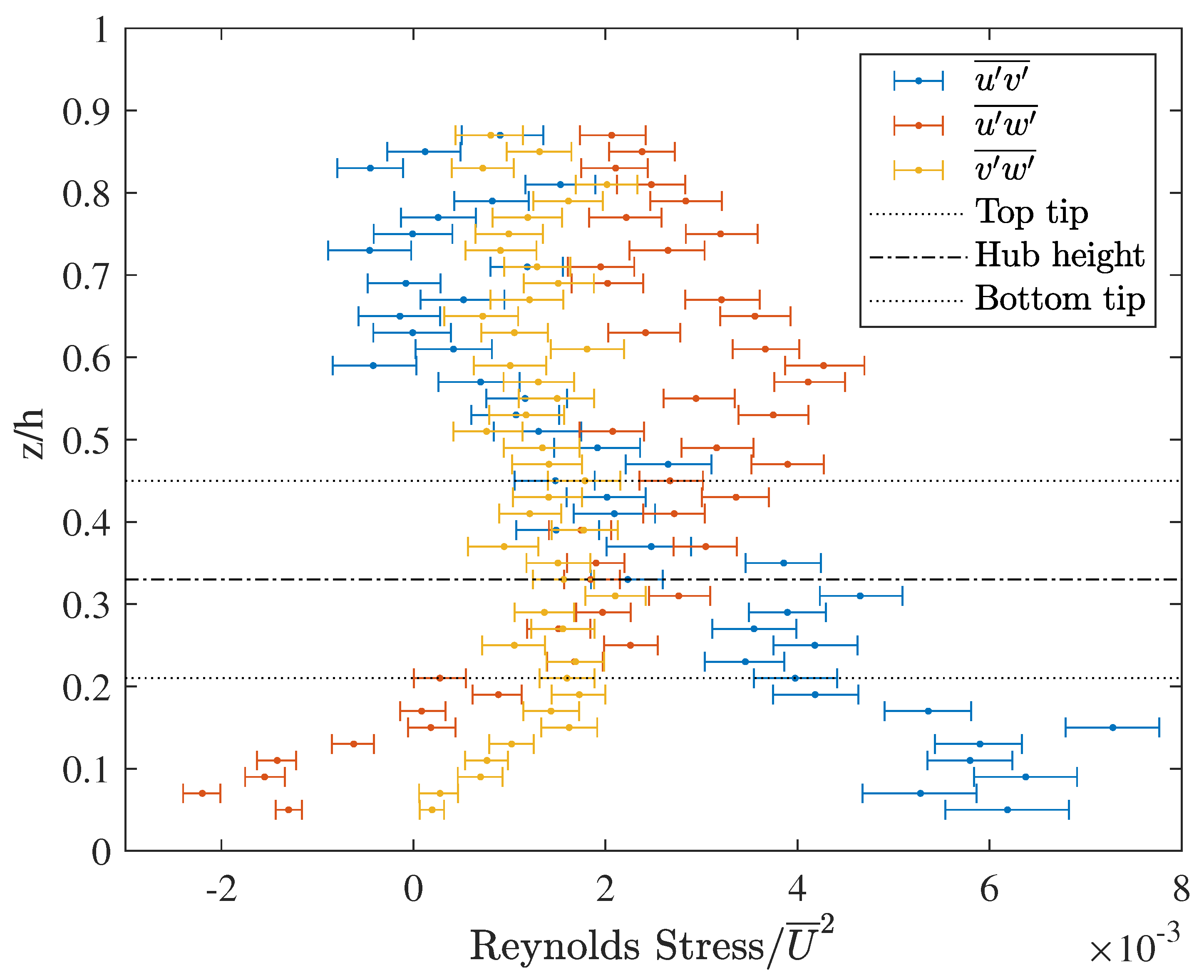 z directions, respectively), turbulence intensities, and Reynolds stresses, respectively. The turbulence intensities are defined as the standard deviations of