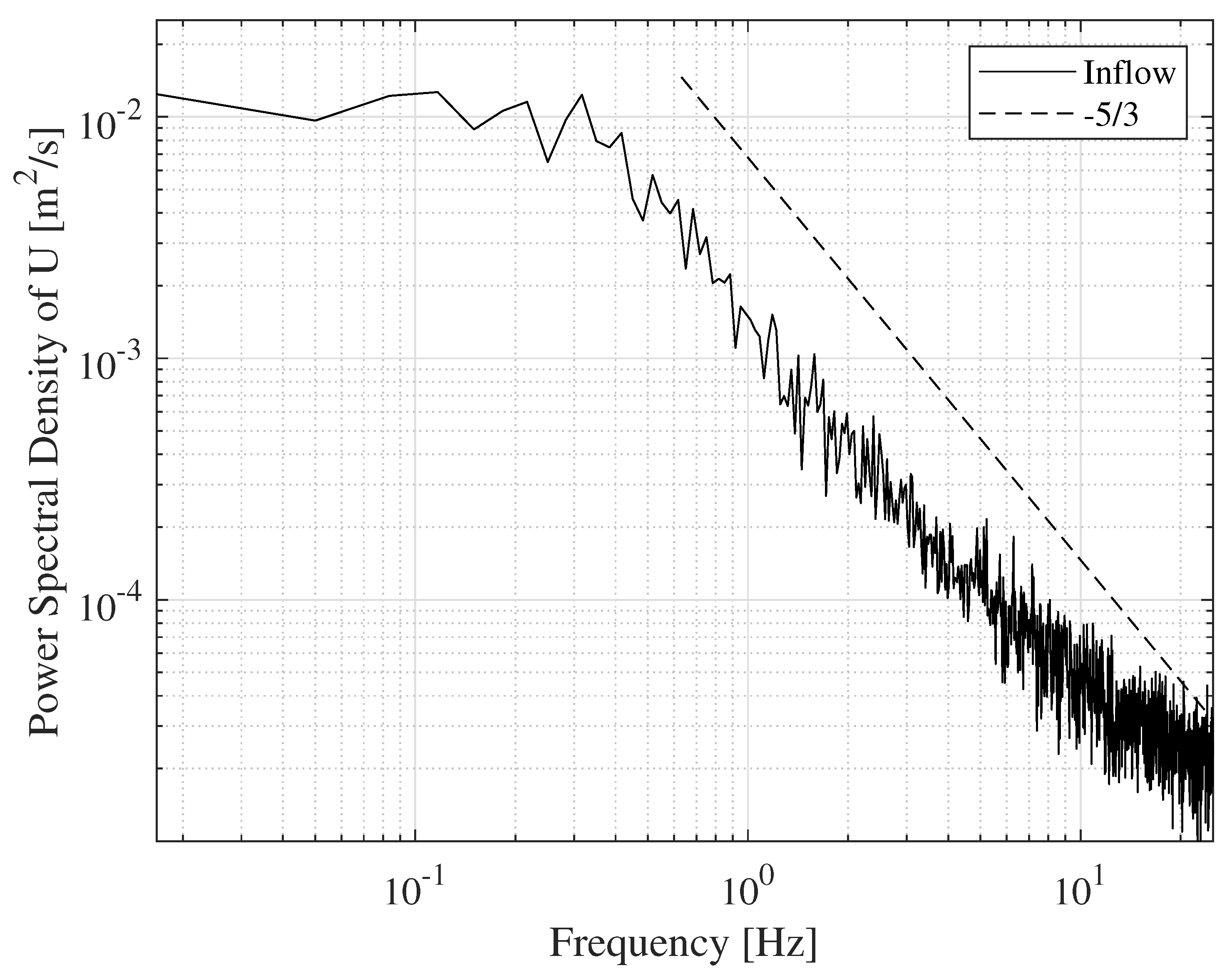 . All freestream measurements were recorded with the ADV sampling at 50 Hz for three minutes with a sampling volume length of 7 mm. A typical hub height, centerline spectrum can be seen in