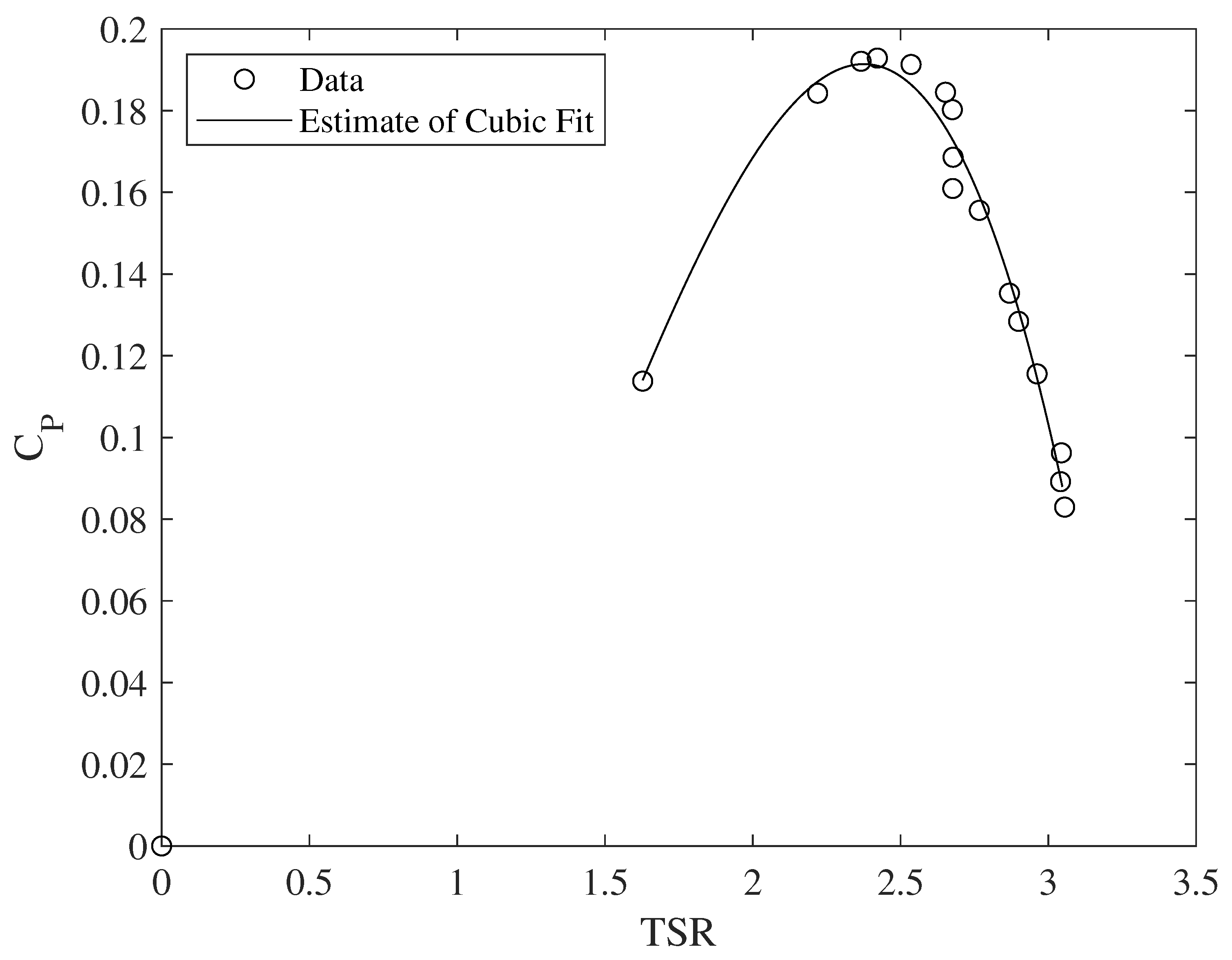 Figure 7, shows the coefficient of power against the tip speed ratio (TSR) and a cubic fit to the data, which is the theoretical form of the
