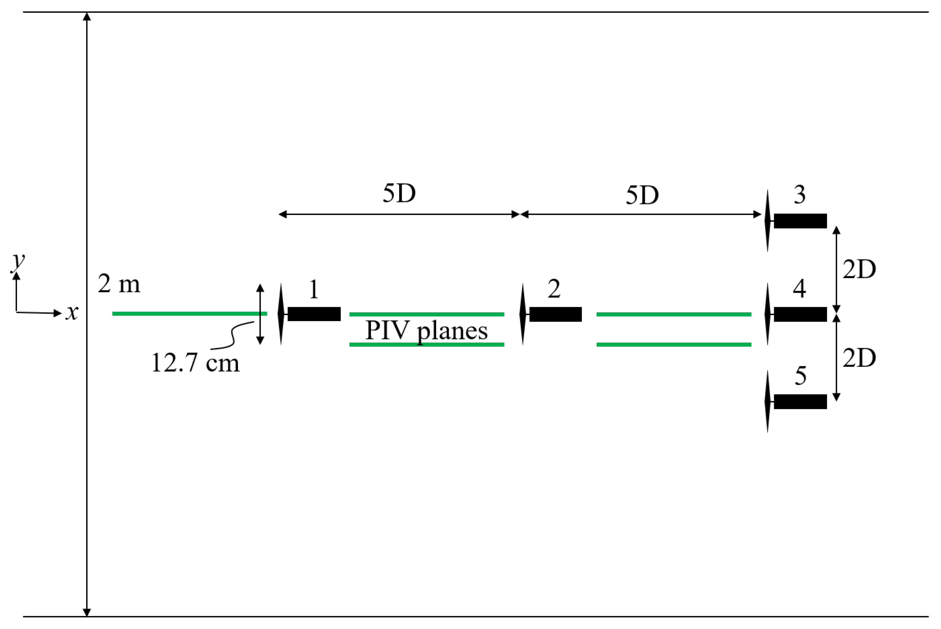Figure 8, and vertically from the bed to 2.32 diameters above it are recorded. The field of view (FOV) is physically 34.9 × 29.5 cm. To capture the freestream flow, the turbines are removed, and to capture the flow in different downstream or cross-stream locations within the array, the array is shifted while keeping the spacing among turbines constant. Specifically, data is collected in streamwise-vertical planes aligned spanwise with the rotor tips of the centerline turbines as well as along their rotor axes in the freestream and between each row (see