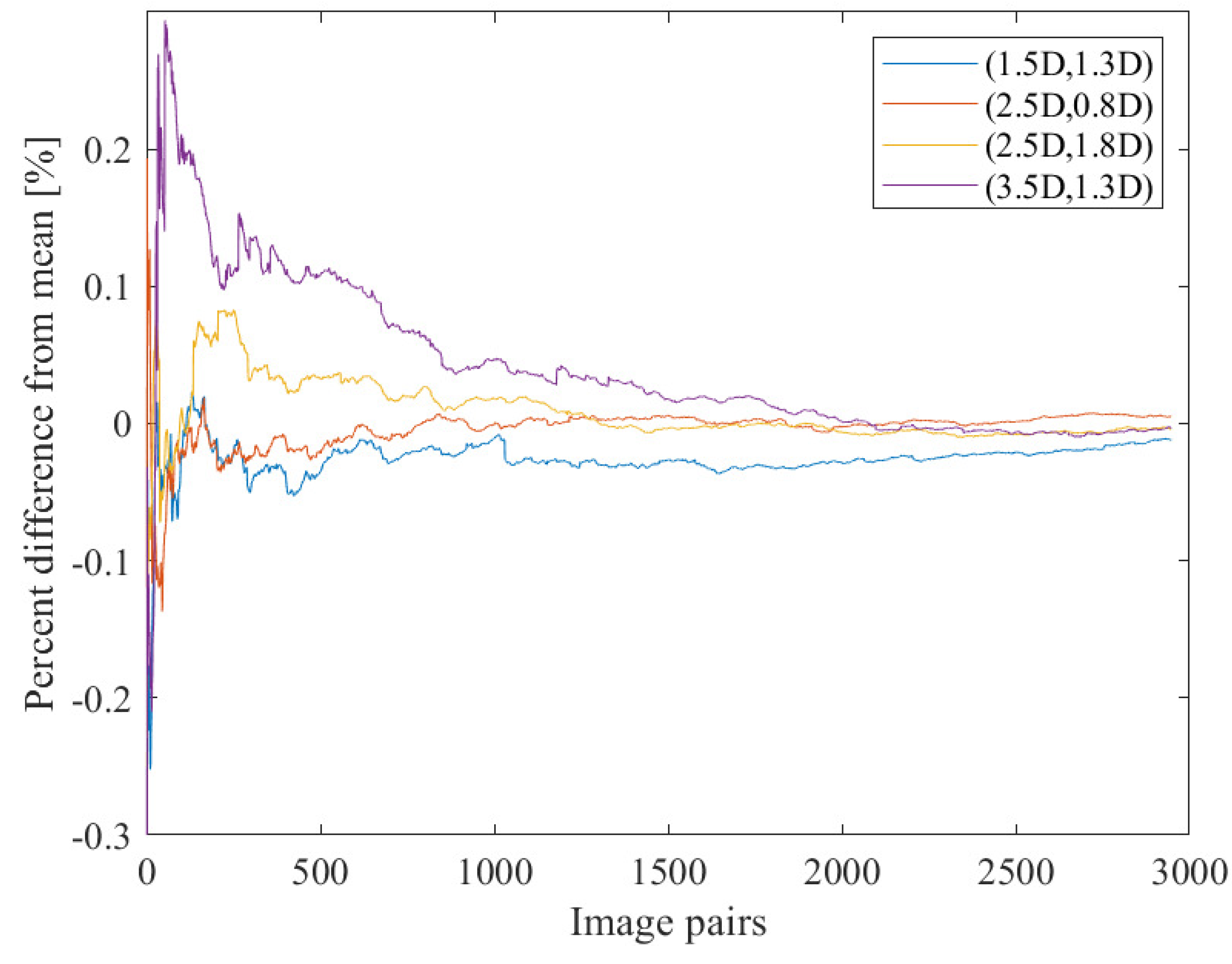 The PIV system consists of an Nd:YAG Spectra Physics 200 mJ/pulse laser and an Andor Zyla 5.5 MP (2560 × 2160 pixels) 16-bit camera whose timings are controlled by Matlab through the DAQ and a function generator. Image pairs are recorded at 10 Hz for 5 min, resulting in 3000 image pairs per data set. The data acquisition rate is set by the laser’s maximum image pair illumination rate and is near, but not quite equal to, the Nyquist frequency for typical rotation rates seen in the experiments. As we do not intend to phase average, this sampling rate is sufficient. A 5-min record length was determined to be sufficient by recording 5- and 10-min samples and evaluating the convergence and uncertainty of different PIV processing methods. By sampling three locations in the FOV and calculating the random error, the processing method described below resulted in differences in the percent random error of less than 1% (i.e., differences in percents of less than one) in the average freestream velocity and as high as 8% in the rms of the freestream turbulence when comparing the 5- and 10-min long records. This is further demonstrated in