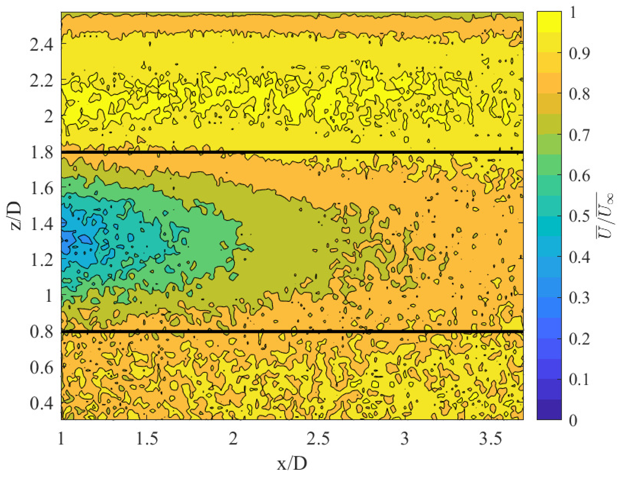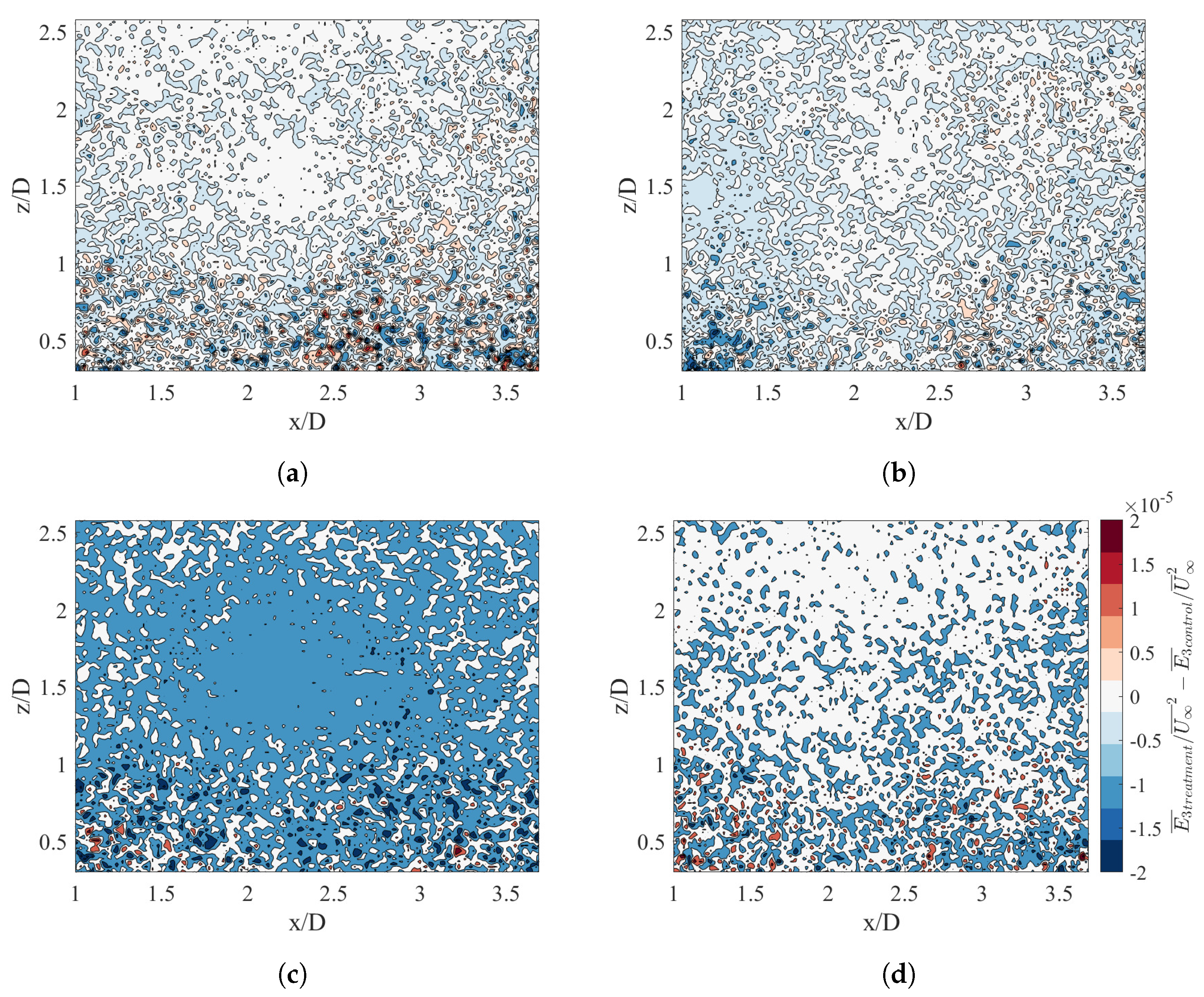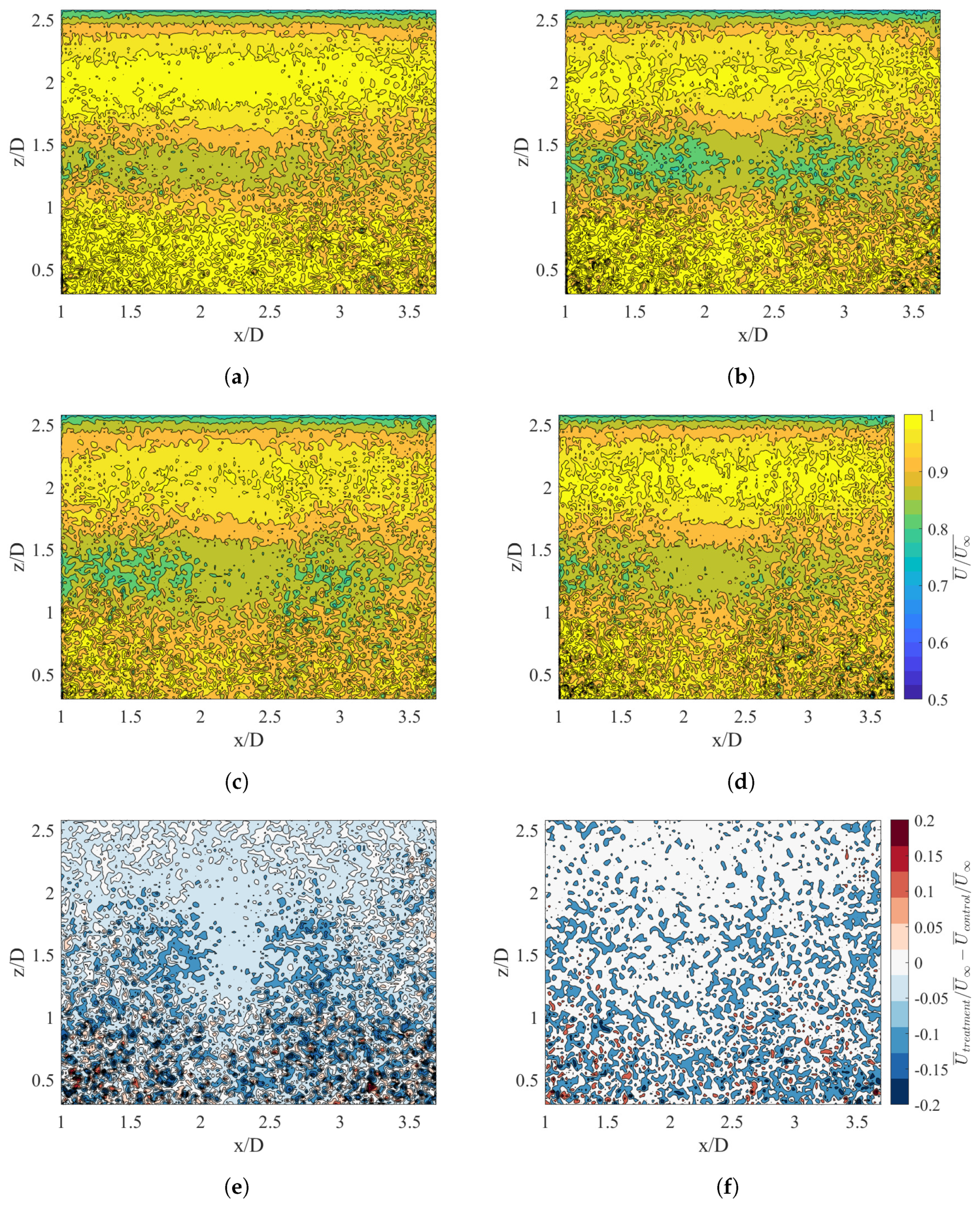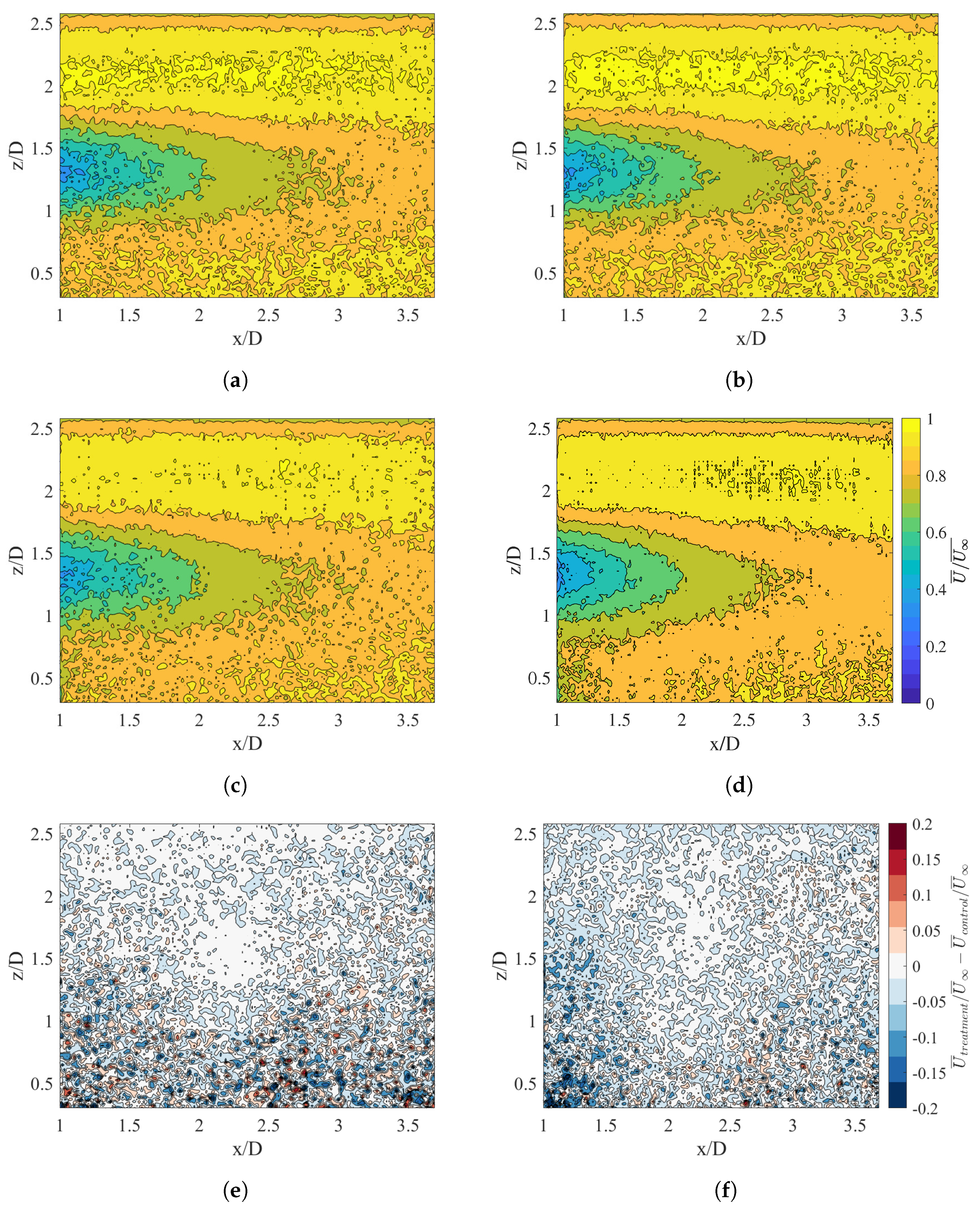 Figure 10), the treatment results in lower velocity in the rotor-swept area and higher velocities below it, with the two nearly netting to zero. That there is a small region of zero difference in the middle suggests that the treatment’s effects are short-lived and perhaps only relevant in the near wake and induction zones. Similarly, along the centerline, the flow has recovered to 80-90% of the freestream by the time it reaches the end of the FOV, which is likely an indication of the research facility’s relatively high turbulence level’s acceleration of the wake decay. Together, these suggest the possibility that the wakes are recovering quickly without the treatment therefore minimizing its impact.