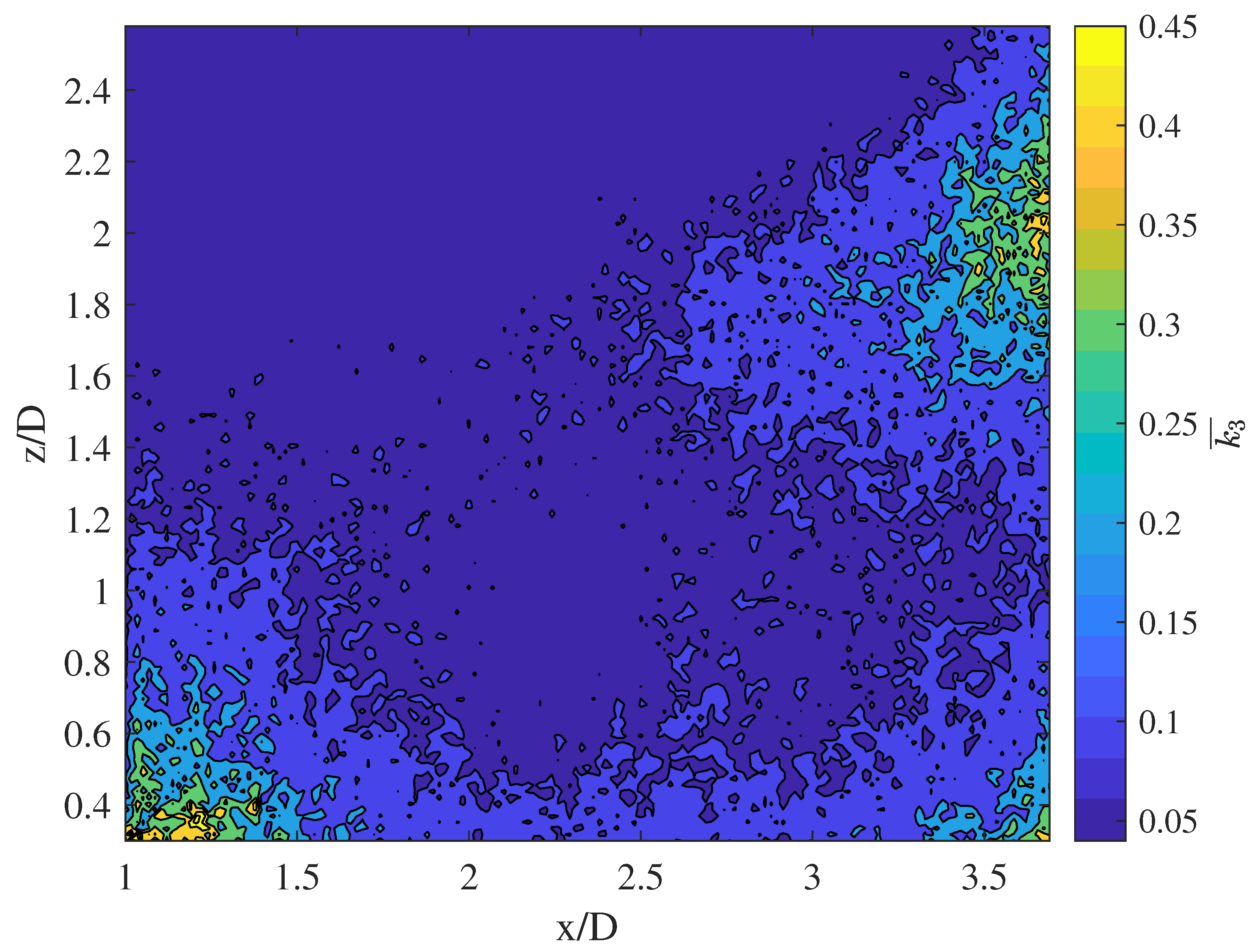 The TKE is more difficult to interpret, even with the power data, because TKE can be created by a turbine’s interactions with the flow or merely advected from upstream. TKE is four to five times higher in the array than the freestream, so there is clearly an increase due to the turbines. One would expect higher turbulence levels along the centerline where the effects of the turbines are concentrated, yet TKE levels are similar in all planes and whether or not the axisymmetric assumption is made in calculating it. It is possible that the lack of phase-averaging has caused all unsteadiness in the flow, including the quasi-periodic tip vortices, to appear as turbulence, and so turbulence levels appear similar inside and at the edges of the wakes.