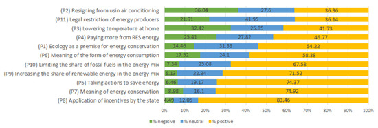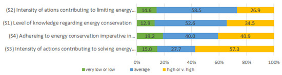 With the attitudes component (Figure 2), the highest number of positive indications was achieved by the acceptance of the state authorities using incentives to encourage conversion to use of energy-efficient appliances 83.5% (4.5% of votes against). The respondents assessed conserving energy equally decisively positively (74.9%), declared the will to take actions aimed at conserving energy (74.4%), and declared in favor of increasing share of RES energy in the energy mix (71.5%). The following postulates were also indicated by more than 50% of respondents: limiting share of fossil fuels in energy mix (67.6%), importance assigned to actions of individuals in the context of solving energy-related problems (58.4%), and ecology as a rationale for conserving energy (54.2%). The willingness to pay more for energy from renewable sources (46.8%), lowering temperature in apartments (41.7%), resigning from using air-conditioning (36.4%), and acceptance for imposing legal restrictions on energy producers due to environmental protection (36.1%) were assessed less favourably.