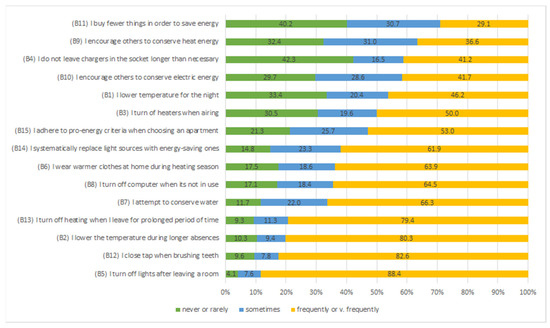 In terms of the “behaviours” category (Figure 3), the following actions were indicated by the greatest percentage of the respondents: switching off lights after leaving a room (88.4%), turning off a tap when brushing teeth (82.6%), lowering the temperature in rooms during periods of prolonged absence (80.3%), or turning off heating when absent (79.4%). The following actions were indicated by more than 50% of the respondents: conserving water (66.3%), turning off computers when not in use (64.5%), wearing warmer clothes in house during the heating season (63.9%), systematically changing light sources for energy efficient light sources (61.9%), as well as taking into account the pro-effectiveness criteria when selecting a place to rent and live in (53.0%). The following behaviours were indicated less frequently: turning off heaters when airing rooms (50.0%), lowering temperature in rooms for the night (46.2%), encouraging others to conserve electric energy (41.7%), not leaving chargers plugged when not in use (41.2%), encouraging others to conserve heat energy (36.2%), and limiting consumption due to the energy conservation postulates (29.1%).