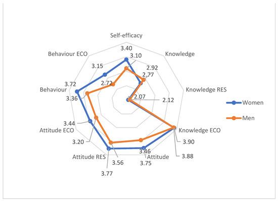 Attitudes, behaviours, knowledge, and self-efficacy of the respondents related to energy, divided according to gender. Source: own study.