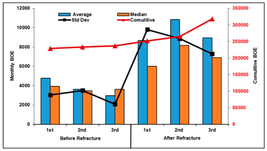 Expected production from re-fractured wells hinges mostly on well selection [2]. Mohaghegh et al. (2017) developed “Shale Analytics” as a self-contained process utilizing ML to optimize well spacing, predict the best candidates for re-fracturing, and construct production decline curves [8]. Other re-fracturing candidate selection algorithms were developed by Mohaghegh (2016). Mohaghegh (2016) concluded that the HF job that created the largest fracture network that maximizes O&G production is optimal, conditioned on trade-offs with costs [9]. This type of process will become increasingly important for re-fracs as well as mature plays experiencing infill drilling and encountering possible parent–child well interactions since the impact depends not only on the age of the parent well, but also on well spacing [10]. The optimization between cost and expected production is crucial for re-fracturing economics due to a high level of uncertainty [3]. Candidate selection is outside the scope of this study, and it is assumed that the best candidates were selected for re-fracturing.