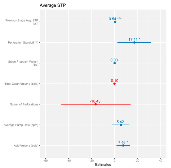 Figure 9 shows the regression results with associated statistical significance. Blue indicates an estimated positive marginal effect and red indicates an estimated negative marginal effect on average STP. This provides a concise visual for quick reference for the results of alternating completion parameters on average STP.