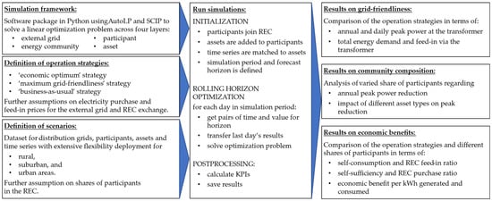 To address the aforementioned questions, a simulation environment is developed that is used to evaluate operation strategies and scenarios of renewable energy community compositions. First, the simulation framework core is described, which solves the coordination problem of the REC as a linear optimization problem. Then, different operation strategies, the corresponding boundary conditions, and the objective function of the optimization are presented. Scenarios with different compositions and grid topologies of the REC are defined. Each REC scenario is within the grid area of a low-voltage substation and considers different shares of participants. Finally, the evaluation metrics for deriving the results are described. An overview of the methods is given in Figure 1, summarizing the assumptions and input variables on the left, the simulation process in the center, and the results and evaluation metrics on the right.
