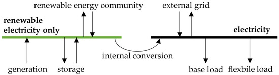 According to the participant’s energy system model, for each participant (p) within the REC and for each time step (t) in the simulation period, the electric power of both categories, ‘renewable electricity only’ (Equation (1)) and ‘electricity’ (Equation (2)), are to be in balance: