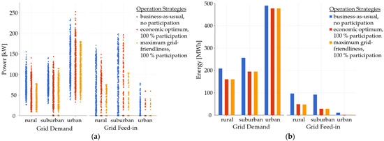 There is a large scatter over the daily power peaks at the low-voltage transformer in Figure 3a. Zero values for the grid demand show full self-sufficiency and for the grid feed-in, full self-consumption, within the observed area during one day. Through both REC operation strategies, this is reached more often than in ‘business-as-usual’ operation or reached at all, on some days. Whenever values above zero occur, an energy exchange via the low-voltage transformer is required at least once a day to cover the demand or to feed in energy surplus. The annual peak load, used for designing the transformer, differs significantly when comparing the three strategies. As listed in Table 3, in the column ‘economic optimum,’ there is no general trend in the annual peak power. In the rural case, it is lower; in the suburban case, about the same; and in the urban case, it is higher than in the ‘business-as-usual’ scenario. Thus, it is difficult for the grid operator to predict whether the operation of flexible assets in this operation strategy might even increase peak loads. This is different with the operation strategy ‘maximum grid-friendliness.’ Here, the peak power is consistently and noticeably reduced by 23% to 55%, compared to ‘business-as-usual’ scenario, and thereby becomes more plannable for grid operators.