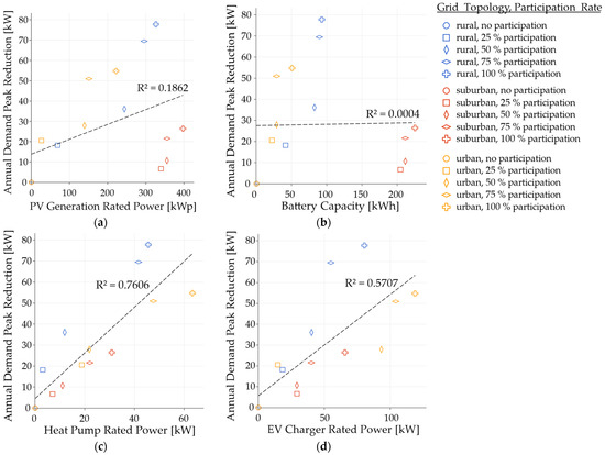 To determine the influence on the amount of peak reduction by the ‘maximum grid-friendliness’ strategy, an analysis of asset types is performed. This is illustrated in Figure 5 considering the design parameters of the assets controlled by the community. These are the rated PV power in kWp, storage capacity in kWh, and flexible load in kW, divided into heat pumps and charging stations for electric vehicles. The correlation between peak reduction and installed assets is shown in each diagram. For this, a linear regression is used, in combination with the coefficient of determination R².