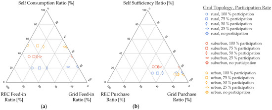 Breakdown based on rural, suburban, and urban simulation cases, different shares of participants, and ‘economic optimum’ operation of (a) generated energy into grid feed-in, REC feed-in, and self-consumption ratio, and (b) consumed energy into grid purchase, REC purchase, and self-sufficiency ratio.