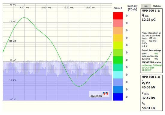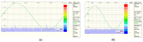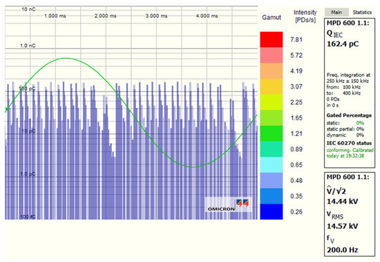 For presenting the problem of interference generated by the typical power frequency converter with the pulse-width modulation topology, the PWM converter was applied to the testing system. As shown in Figure 19, and at a testing voltage of about 14.4 kV, the noise level of 162.4 pC was very high—much higher than the acceptable level of 2.5 pC.