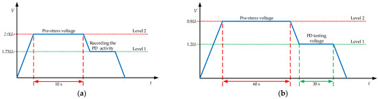 To confirm the insulation performance of the HV equipment in HV tests, the testing voltage must be increased to a level greater than the rating voltage. The power frequency (50 Hz or 60 Hz) of the testing voltage can be used in the HV test for capacitance loads such as insulators, bushings, cables, etc. For example, in the HV and PD testing of a power cable [4] (U0 = 12 kV) for the pre-stress condition, a voltage of 2U0 (24 kV) is applied to the cable, and then the testing voltage is reduced to the level of 1.73U0 (20.8 kV) to record the PD activity. Figure 2a shows the procedure of applying voltage in the PD test for the cable.