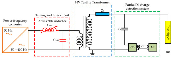 In Figure 3, the developed system represented by the equivalent circuit is composed of a power frequency converter, an additional inductor, an additional capacitor, an HV testing transformer, and a partial discharge detection system. The terms Zf, Ck, CD, CC, and MI refer to the internal impedances of a testing transformer, a coupling capacitor, a coupling device (the measuring impedance), a coaxial measuring cable, and a measuring instrument, respectively.