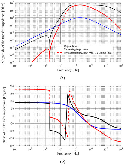 Transfer impedance in the frequency domain of the measuring impedance: (a) magnitude; (b) phase angle (degree).
