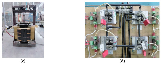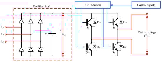 In this paper, the power frequency converter previously developed in [6,7,8,9,10,11,12,13,14] with the H-bridge configuration, as depicted in Figure 6, was utilized in experiments for validation of the proposed method. The simple H-bridge converter with an RC snubber circuit was designed as per the recommendations in [16]. The resistance and capacitance of the snubber circuit were 39 Ω and 75 nF, respectively. The insulated-gate bipolar transistor (IGBT) type of IXXN110N65B4H1—of which the specifications [17] are VCBS = 650 V, IC110 = 110 A, VCE(sat) ≤ 2.1 V, and tfi(typ) = 85 ns—was selected for the H-bridge converter. From the voltage specification, the maximum input voltage of the converter is 1300 V, which is sufficient for the applied DC voltage from the rectifier (Vp = 537 V). The IGBTs in the converter can be programmed to produce either square-wave or pulse-width modulation (PWM) waveforms.