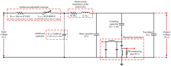 In the case of the resonant converter, the resonant condition is required, and the square wave is the best choice of the generation from the converter, because the component of the square waveform at the fundamental frequency is higher than that of the PWM one. The tuning and filter circuit in Figure 3 must be implemented with the testing system, of which the equivalent circuit is expressed in Figure 8. All impedances can be transferred to the low-voltage (LV) or HV side for simplicity in the circuit analysis. For this paper, all impedances were transferred to the HV side. The adjustable inductance and the additional capacitance were selected to determine the resonant condition at the desired testing frequency. To design the proper tuning and filter circuit, the circuit parameters of the system, along with the parasitic and stray inductance and capacitance, are required. Nonetheless, some of these parameters cannot be measured accurately using a conventional impedance meter, because the equivalent circuit of the testing system cannot be represented by the simple configurations from which the meter can extract the circuit components. In the design process [13,14], the parameters in the simulation were adjusted to obtain results that were consistent with the experimental ones. It would be advantageous in the system design if the circuit parameters could be determined accurately.